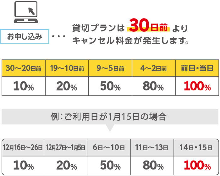 なお、お客様の安全を第一に考え、台風や大雪などの自然災害、または交通機関の運休・欠航・通行止め等のやむを得ない事情によりご来館が困難な場合には、キャンセル料は頂戴しておりません(気象庁や交通各社の公式発表がある場合など)。