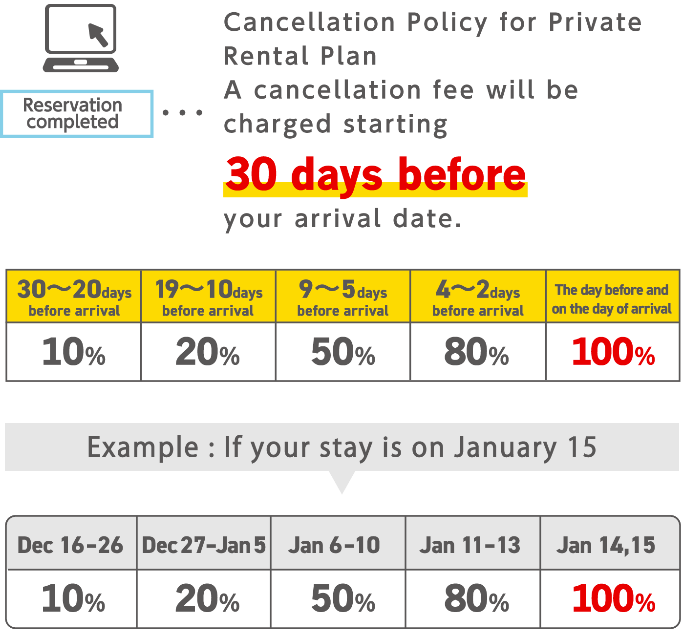 For your safety, we do not charge a cancellation fee if your stay becomes impossible due to unavoidable circumstances such as typhoons, heavy snow, or transportation disruptions (road closures, train suspensions, or flight cancellations) based on official announcements from the Meteorological Agency or transportation companies.